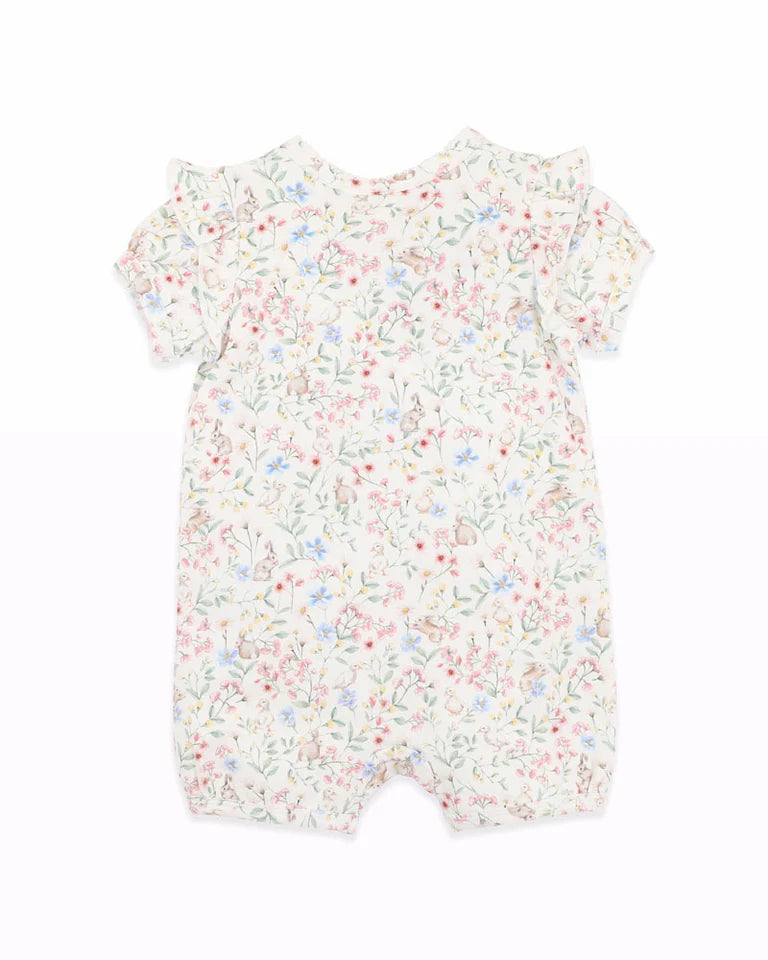 This charming romper features a delicate bunny and floral print in soft pastel tones, perfect for everyday wear or special occasions. Thoughtfully designed for both style and practicality, it includes a sweet frill trim alongside the front zip and a dainty picot edge at the neckline. Crafted from a soft organic cotton blend with added stretch, it ensures all-day comfort for your little one, while the zip-through front with a press stud closure at the top makes dressing and changing simple.
